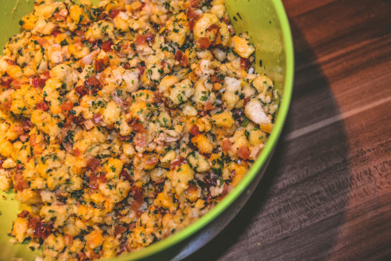 - Die Semmelwürfel gemeinsam mit dem Speck und der Petersilie in eine Rührschüssel geben und kurz mit der Hand vermischen.